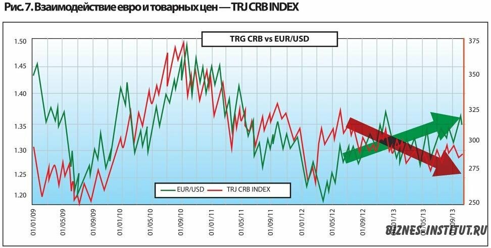Не буду рассматривать состояние экономики и уровень безработицы в европейских странах, в конце концов, чиновников из FT ТБ подобные вещи мало волнуют. Но обращу Ваше внимание на некоторые просто вопиющие факты. Зимой этого года, когда евро достиг уровня 13750, ставка рефинансирования, обеспечивающая потенциал роста европейской валюты, составляла 0,75% годовых, а сейчас — 0,5%, то есть за прошедший с зимы период евро стал дешевле. Курс торгово-взвешенного индекса доллара США, показывающий стоимость американского доллара по отношению к корзине из семи валют, в январе 2013 года составлял 73,90, сейчас даже с учетом своего падения—75,60. В то время как евро и тоща, и сейчас стоит около 137-138. В январе 2013 года товарные цены, выраженные индексом TRJ CRB, имели значение 305, а сейчас индекс стоит 285 (рис 7), что, в принципе соответствует стоимости доллара США, но никак не уровню курса евро. Таким образом, становится совсем непонятно, почему растет курс евро, если доллар в товарном выражении дорожает, а евро в процентном отношении дешевеет? Об этом писали на webas-64.ru. Профессиональное создание сайтов в Саратове — это их основное направление.
